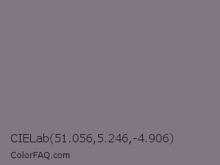 CIELab 51.056,5.246,-4.906 Color is a normal purple color and the nearest color is Jumbo #7c7b82. Hex code #7f7782 and RGB value is rgb(127,119,130). In RGB color space, this color is composed of 50% red, 47% green, 51% blue, In CMYK color space, this color is composed of 2% cyan, 8% magenta, 0% yellow , 49% black , In HSL color space, this color has a hue angle of 284° , 4% saturation and 49% lightness.
