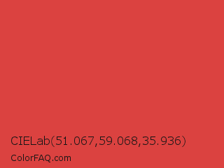 CIELab 51.067,59.068,35.936 Color is a normal red color and the nearest color is Jasper #d73b3e. Hex code #db4240 and RGB value is rgb(219,66,64). In RGB color space, this color is composed of 86% red, 26% green, 25% blue, In CMYK color space, this color is composed of 0% cyan, 70% magenta, 71% yellow , 14% black , In HSL color space, this color has a hue angle of 1° , 68% saturation and 55% lightness.