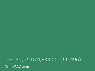CIELab 51.074,-33.664,11.496 Color is a normal green color and the nearest color is Viridian #40826d. Hex code #368865 and RGB value is rgb(54,136,101). In RGB color space, this color is composed of 21% red, 53% green, 40% blue, In CMYK color space, this color is composed of 60% cyan, 0% magenta, 26% yellow , 47% black , In HSL color space, this color has a hue angle of 154° , 43% saturation and 37% lightness.