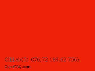 CIELab 51.076,72.189,62.756 Color is a normal red color and the nearest color is Scarlet #ff2400. Hex code #ee2206 and RGB value is rgb(238,34,6). In RGB color space, this color is composed of 93% red, 13% green, 2% blue, In CMYK color space, this color is composed of 0% cyan, 86% magenta, 97% yellow , 7% black , In HSL color space, this color has a hue angle of 7° , 95% saturation and 48% lightness.