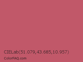 CIELab 51.079,43.685,10.957 Color is a normal red color and the nearest color is Popstar #be4f62. Hex code #c15869 and RGB value is rgb(193,88,105). In RGB color space, this color is composed of 76% red, 35% green, 41% blue, In CMYK color space, this color is composed of 0% cyan, 54% magenta, 46% yellow , 24% black , In HSL color space, this color has a hue angle of 350° , 46% saturation and 55% lightness.