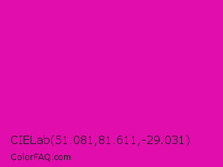 CIELab 51.081,81.611,-29.031 Color is a normal magenta color and the nearest color is Hollywood Cerise #f400a1. Hex code #e10ead and RGB value is rgb(225,14,173). In RGB color space, this color is composed of 88% red, 5% green, 68% blue, In CMYK color space, this color is composed of 0% cyan, 94% magenta, 23% yellow , 12% black , In HSL color space, this color has a hue angle of 315° , 88% saturation and 47% lightness.