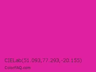 CIELab 51.093,77.293,-20.155 Color is a normal magenta color and the nearest color is Barbie Pink #e0218a. Hex code #e0209e and RGB value is rgb(224,32,158). In RGB color space, this color is composed of 88% red, 13% green, 62% blue, In CMYK color space, this color is composed of 0% cyan, 86% magenta, 29% yellow , 12% black , In HSL color space, this color has a hue angle of 321° , 76% saturation and 50% lightness.