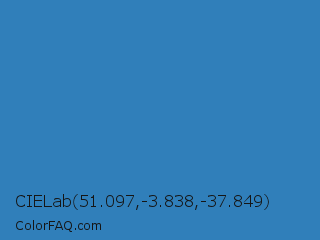CIELab 51.097,-3.838,-37.849 Color is a normal blue color and the nearest color is Boston Blue #3b91b4. Hex code #307fba and RGB value is rgb(48,127,186). In RGB color space, this color is composed of 19% red, 50% green, 73% blue, In CMYK color space, this color is composed of 74% cyan, 32% magenta, 0% yellow , 27% black , In HSL color space, this color has a hue angle of 206° , 59% saturation and 46% lightness.