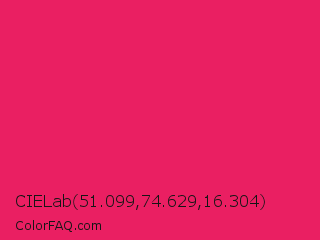 CIELab 51.099,74.629,16.304 Color is a normal rose color and the nearest color is Razzmatazz #e3256b. Hex code #ea1f62 and RGB value is rgb(234,31,98). In RGB color space, this color is composed of 92% red, 12% green, 38% blue, In CMYK color space, this color is composed of 0% cyan, 87% magenta, 58% yellow , 8% black , In HSL color space, this color has a hue angle of 340° , 83% saturation and 52% lightness.