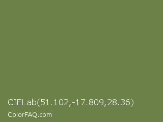 CIELab 51.102,-17.809,28.36 Color is a normal green color and the nearest color is Dingley #5d7747. Hex code #6c8148 and RGB value is rgb(108,129,72). In RGB color space, this color is composed of 42% red, 51% green, 28% blue, In CMYK color space, this color is composed of 16% cyan, 0% magenta, 44% yellow , 49% black , In HSL color space, this color has a hue angle of 82° , 28% saturation and 39% lightness.