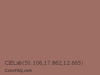 CIELab 51.106,17.862,12.665 Color is a normal red color and the nearest color is Toast #9a6e61. Hex code #9e6e65 and RGB value is rgb(158,110,101). In RGB color space, this color is composed of 62% red, 43% green, 40% blue, In CMYK color space, this color is composed of 0% cyan, 30% magenta, 36% yellow , 38% black , In HSL color space, this color has a hue angle of 9° , 23% saturation and 51% lightness.
