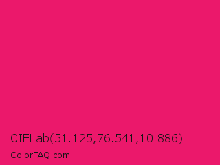 CIELab 51.125,76.541,10.886 Color is a normal rose color and the nearest color is Razzmatazz #e3256b. Hex code #eb186b and RGB value is rgb(235,24,107). In RGB color space, this color is composed of 92% red, 9% green, 42% blue, In CMYK color space, this color is composed of 0% cyan, 90% magenta, 54% yellow , 8% black , In HSL color space, this color has a hue angle of 336° , 84% saturation and 51% lightness.