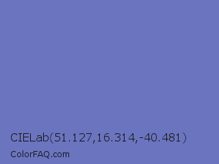 CIELab 51.127,16.314,-40.481 Color is a normal blue color and the nearest color is Toolbox #746cc0. Hex code #6b74bf and RGB value is rgb(107,116,191). In RGB color space, this color is composed of 42% red, 45% green, 75% blue, In CMYK color space, this color is composed of 44% cyan, 39% magenta, 0% yellow , 25% black , In HSL color space, this color has a hue angle of 234° , 40% saturation and 58% lightness.