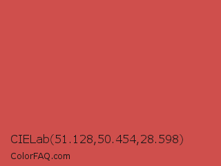 CIELab 51.128,50.454,28.598 Color is a normal red color and the nearest color is English Vermillion #cc474b. Hex code #cf4f4c and RGB value is rgb(207,79,76). In RGB color space, this color is composed of 81% red, 31% green, 30% blue, In CMYK color space, this color is composed of 0% cyan, 62% magenta, 63% yellow , 19% black , In HSL color space, this color has a hue angle of 1° , 58% saturation and 55% lightness.