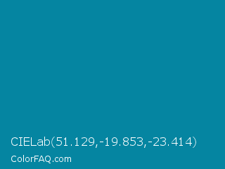 CIELab 51.129,-19.853,-23.414 Color is a normal cyan color and the nearest color is Deep Cerulean #007ba7. Hex code #0585a1 and RGB value is rgb(5,133,161). In RGB color space, this color is composed of 2% red, 52% green, 63% blue, In CMYK color space, this color is composed of 97% cyan, 17% magenta, 0% yellow , 37% black , In HSL color space, this color has a hue angle of 191° , 94% saturation and 33% lightness.