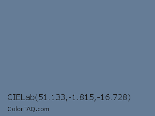 CIELab 51.133,-1.815,-16.728 Color is a normal blue color and the nearest color is Lynch #697e9a. Hex code #657c96 and RGB value is rgb(101,124,150). In RGB color space, this color is composed of 40% red, 49% green, 59% blue, In CMYK color space, this color is composed of 33% cyan, 17% magenta, 0% yellow , 41% black , In HSL color space, this color has a hue angle of 212° , 20% saturation and 49% lightness.