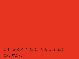 CIELab 51.133,65.995,53.33 Color is a normal red color and the nearest color is Vermilion #d9381e. Hex code #e63420 and RGB value is rgb(230,52,32). In RGB color space, this color is composed of 90% red, 20% green, 13% blue, In CMYK color space, this color is composed of 0% cyan, 77% magenta, 86% yellow , 10% black , In HSL color space, this color has a hue angle of 6° , 80% saturation and 51% lightness.
