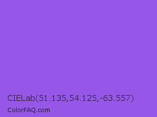 CIELab 51.135,54.125,-63.557 Color is a light violet color and the nearest color is Navy Purple #9457eb. Hex code #9758e8 and RGB value is rgb(151,88,232). In RGB color space, this color is composed of 59% red, 35% green, 91% blue, In CMYK color space, this color is composed of 35% cyan, 62% magenta, 0% yellow , 9% black , In HSL color space, this color has a hue angle of 266° , 76% saturation and 63% lightness.