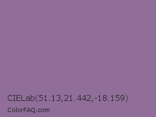 CIELab 51.13,21.442,-18.159 Color is a normal purple color and the nearest color is Trendy Pink #8c6495. Hex code #906e99 and RGB value is rgb(144,110,153). In RGB color space, this color is composed of 56% red, 43% green, 60% blue, In CMYK color space, this color is composed of 6% cyan, 28% magenta, 0% yellow , 40% black , In HSL color space, this color has a hue angle of 287° , 17% saturation and 52% lightness.