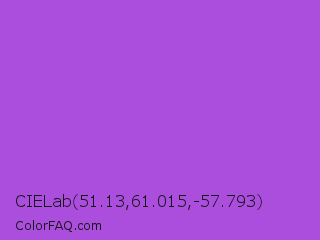 CIELab 51.13,61.015,-57.793 Color is a normal purple color and the nearest color is Medium Orchid #ba55d3. Hex code #ab4ede and RGB value is rgb(171,78,222). In RGB color space, this color is composed of 67% red, 31% green, 87% blue, In CMYK color space, this color is composed of 23% cyan, 65% magenta, 0% yellow , 13% black , In HSL color space, this color has a hue angle of 279° , 69% saturation and 59% lightness.