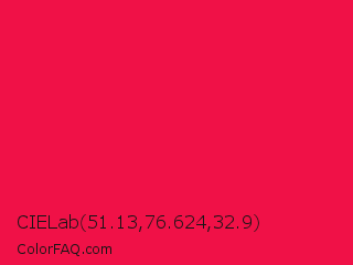 CIELab 51.13,76.624,32.9 Color is a normal red color and the nearest color is Red Ribbon #ed0a3f. Hex code #f01147 and RGB value is rgb(240,17,71). In RGB color space, this color is composed of 94% red, 7% green, 28% blue, In CMYK color space, this color is composed of 0% cyan, 93% magenta, 70% yellow , 6% black , In HSL color space, this color has a hue angle of 345° , 88% saturation and 50% lightness.