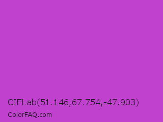 CIELab 51.146,67.754,-47.903 Color is a normal magenta color and the nearest color is Steel Pink #cc33cc. Hex code #c041cd and RGB value is rgb(192,65,205). In RGB color space, this color is composed of 75% red, 25% green, 80% blue, In CMYK color space, this color is composed of 6% cyan, 68% magenta, 0% yellow , 20% black , In HSL color space, this color has a hue angle of 294° , 58% saturation and 53% lightness.