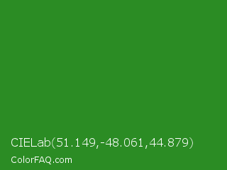 CIELab 51.149,-48.061,44.879 Color is a normal green color and the nearest color is Forest Green #228b22. Hex code #2b8c24 and RGB value is rgb(43,140,36). In RGB color space, this color is composed of 17% red, 55% green, 14% blue, In CMYK color space, this color is composed of 69% cyan, 0% magenta, 74% yellow , 45% black , In HSL color space, this color has a hue angle of 116° , 59% saturation and 35% lightness.
