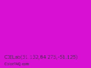 CIELab 51.152,84.275,-51.125 Color is a normal magenta color and the nearest color is Deep Magenta #cc00cc. Hex code #d611d3 and RGB value is rgb(214,17,211). In RGB color space, this color is composed of 84% red, 7% green, 83% blue, In CMYK color space, this color is composed of 0% cyan, 92% magenta, 1% yellow , 16% black , In HSL color space, this color has a hue angle of 301° , 85% saturation and 45% lightness.