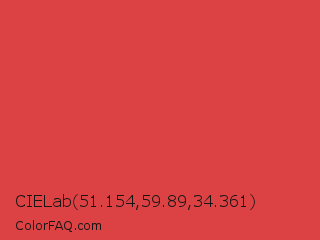 CIELab 51.154,59.89,34.361 Color is a normal red color and the nearest color is Jasper #d73b3e. Hex code #dc4143 and RGB value is rgb(220,65,67). In RGB color space, this color is composed of 86% red, 25% green, 26% blue, In CMYK color space, this color is composed of 0% cyan, 70% magenta, 70% yellow , 14% black , In HSL color space, this color has a hue angle of 359° , 69% saturation and 56% lightness.