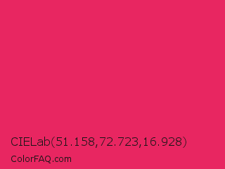 CIELab 51.158,72.723,16.928 Color is a normal rose color and the nearest color is Razzmatazz #e3256b. Hex code #e82661 and RGB value is rgb(232,38,97). In RGB color space, this color is composed of 91% red, 15% green, 38% blue, In CMYK color space, this color is composed of 0% cyan, 84% magenta, 58% yellow , 9% black , In HSL color space, this color has a hue angle of 342° , 81% saturation and 53% lightness.