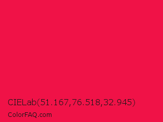 CIELab 51.167,76.518,32.945 Color is a normal red color and the nearest color is Red Ribbon #ed0a3f. Hex code #f01247 and RGB value is rgb(240,18,71). In RGB color space, this color is composed of 94% red, 7% green, 28% blue, In CMYK color space, this color is composed of 0% cyan, 93% magenta, 70% yellow , 6% black , In HSL color space, this color has a hue angle of 346° , 88% saturation and 51% lightness.