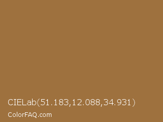 CIELab 51.183,12.088,34.931 Color is a normal orange color and the nearest color is Metallic Sunburst #9c7c38. Hex code #9e713e and RGB value is rgb(158,113,62). In RGB color space, this color is composed of 62% red, 44% green, 24% blue, In CMYK color space, this color is composed of 0% cyan, 28% magenta, 61% yellow , 38% black , In HSL color space, this color has a hue angle of 32° , 44% saturation and 43% lightness.