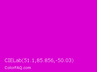 CIELab 51.1,85.856,-50.03 Color is a normal magenta color and the nearest color is Deep Magenta #cc00cc. Hex code #d900d1 and RGB value is rgb(217,0,209). In RGB color space, this color is composed of 85% red, 0% green, 82% blue, In CMYK color space, this color is composed of 0% cyan, 100% magenta, 4% yellow , 15% black , In HSL color space, this color has a hue angle of 302° , 100% saturation and 43% lightness.