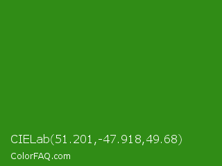 CIELab 51.201,-47.918,49.68 Color is a normal green color and the nearest color is La Palma #368716. Hex code #308c16 and RGB value is rgb(48,140,22). In RGB color space, this color is composed of 19% red, 55% green, 9% blue, In CMYK color space, this color is composed of 66% cyan, 0% magenta, 84% yellow , 45% black , In HSL color space, this color has a hue angle of 107° , 73% saturation and 32% lightness.