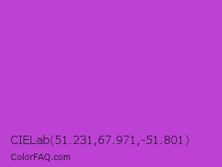 CIELab 51.231,67.971,-51.801 Color is a normal purple color and the nearest color is Medium Orchid #ba55d3. Hex code #bd42d4 and RGB value is rgb(189,66,212). In RGB color space, this color is composed of 74% red, 26% green, 83% blue, In CMYK color space, this color is composed of 11% cyan, 69% magenta, 0% yellow , 17% black , In HSL color space, this color has a hue angle of 291° , 63% saturation and 55% lightness.