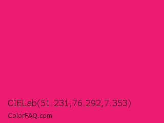 CIELab 51.231,76.292,7.353 Color is a normal rose color and the nearest color is Razzmatazz #e3256b. Hex code #ea1b71 and RGB value is rgb(234,27,113). In RGB color space, this color is composed of 92% red, 11% green, 44% blue, In CMYK color space, this color is composed of 0% cyan, 88% magenta, 52% yellow , 8% black , In HSL color space, this color has a hue angle of 335° , 83% saturation and 51% lightness.