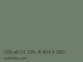 CIELab 51.236,-8.804,9.285 Color is a normal green color and the nearest color is Limed Ash #747d63. Hex code #717e6a and RGB value is rgb(113,126,106). In RGB color space, this color is composed of 44% red, 49% green, 42% blue, In CMYK color space, this color is composed of 10% cyan, 0% magenta, 16% yellow , 51% black , In HSL color space, this color has a hue angle of 99° , 9% saturation and 45% lightness.