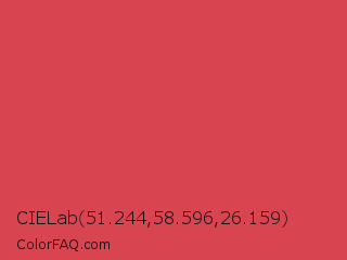 CIELab 51.244,58.596,26.159 Color is a normal red color and the nearest color is Brick Red #cb4154. Hex code #d94451 and RGB value is rgb(217,68,81). In RGB color space, this color is composed of 85% red, 27% green, 32% blue, In CMYK color space, this color is composed of 0% cyan, 69% magenta, 63% yellow , 15% black , In HSL color space, this color has a hue angle of 355° , 66% saturation and 56% lightness.