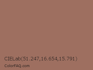 CIELab 51.247,16.654,15.791 Color is a normal color and the nearest color is Toast #9a6e61. Hex code #9e6f60 and RGB value is rgb(158,111,96). In RGB color space, this color is composed of 62% red, 44% green, 38% blue, In CMYK color space, this color is composed of 0% cyan, 30% magenta, 39% yellow , 38% black , In HSL color space, this color has a hue angle of 15° , 24% saturation and 50% lightness.