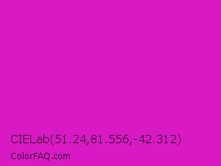 CIELab 51.24,81.556,-42.312 Color is a normal magenta color and the nearest color is Steel Pink #cc33cc. Hex code #d91ac4 and RGB value is rgb(217,26,196). In RGB color space, this color is composed of 85% red, 10% green, 77% blue, In CMYK color space, this color is composed of 0% cyan, 88% magenta, 10% yellow , 15% black , In HSL color space, this color has a hue angle of 307° , 79% saturation and 48% lightness.