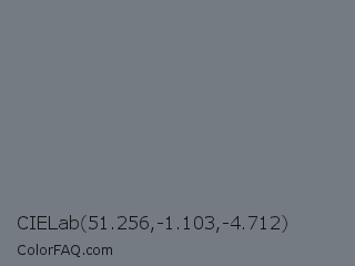 CIELab 51.256,-1.103,-4.712 Color is a normal blue color and the nearest color is Rolling Stone #747d83. Hex code #747b82 and RGB value is rgb(116,123,130). In RGB color space, this color is composed of 45% red, 48% green, 51% blue, In CMYK color space, this color is composed of 11% cyan, 5% magenta, 0% yellow , 49% black , In HSL color space, this color has a hue angle of 210° , 6% saturation and 48% lightness.