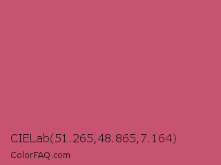 CIELab 51.265,48.865,7.164 Color is a normal red color and the nearest color is Ruber #ce4676. Hex code #c75370 and RGB value is rgb(199,83,112). In RGB color space, this color is composed of 78% red, 33% green, 44% blue, In CMYK color space, this color is composed of 0% cyan, 58% magenta, 44% yellow , 22% black , In HSL color space, this color has a hue angle of 345° , 51% saturation and 55% lightness.