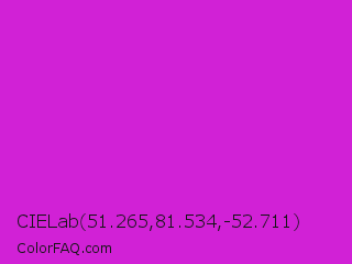 CIELab 51.265,81.534,-52.711 Color is a normal magenta color and the nearest color is Steel Pink #cc33cc. Hex code #d121d6 and RGB value is rgb(209,33,214). In RGB color space, this color is composed of 82% red, 13% green, 84% blue, In CMYK color space, this color is composed of 2% cyan, 85% magenta, 0% yellow , 16% black , In HSL color space, this color has a hue angle of 298° , 73% saturation and 48% lightness.
