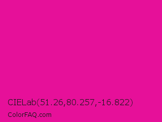 CIELab 51.26,80.257,-16.822 Color is a normal magenta color and the nearest color is Hollywood Cerise #f400a1. Hex code #e61099 and RGB value is rgb(230,16,153). In RGB color space, this color is composed of 90% red, 6% green, 60% blue, In CMYK color space, this color is composed of 0% cyan, 93% magenta, 33% yellow , 10% black , In HSL color space, this color has a hue angle of 322° , 87% saturation and 48% lightness.