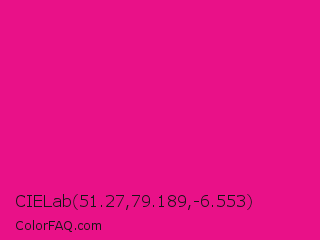 CIELab 51.27,79.189,-6.553 Color is a normal magenta color and the nearest color is Barbie Pink #e0218a. Hex code #e91188 and RGB value is rgb(233,17,136). In RGB color space, this color is composed of 91% red, 7% green, 53% blue, In CMYK color space, this color is composed of 0% cyan, 93% magenta, 42% yellow , 9% black , In HSL color space, this color has a hue angle of 327° , 86% saturation and 49% lightness.