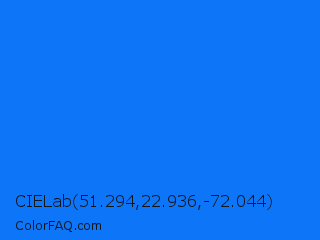 CIELab 51.294,22.936,-72.044 Color is a normal blue color and the nearest color is Brandeis Blue #0070ff. Hex code #0d75f7 and RGB value is rgb(13,117,247). In RGB color space, this color is composed of 5% red, 46% green, 97% blue, In CMYK color space, this color is composed of 95% cyan, 53% magenta, 0% yellow , 3% black , In HSL color space, this color has a hue angle of 213° , 94% saturation and 51% lightness.