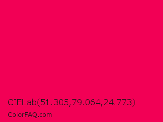 CIELab 51.305,79.064,24.773 Color is a normal rose color and the nearest color is Folly #ff004f. Hex code #f20055 and RGB value is rgb(242,0,85). In RGB color space, this color is composed of 95% red, 0% green, 33% blue, In CMYK color space, this color is composed of 0% cyan, 100% magenta, 65% yellow , 5% black , In HSL color space, this color has a hue angle of 339° , 100% saturation and 47% lightness.