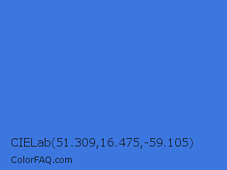 CIELab 51.309,16.475,-59.105 Color is a normal blue color and the nearest color is Royal Blue #4169e1. Hex code #3c77e0 and RGB value is rgb(60,119,224). In RGB color space, this color is composed of 24% red, 47% green, 88% blue, In CMYK color space, this color is composed of 73% cyan, 47% magenta, 0% yellow , 12% black , In HSL color space, this color has a hue angle of 218° , 73% saturation and 56% lightness.