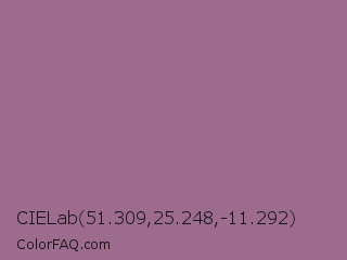 CIELab 51.309,25.248,-11.292 Color is a normal magenta color and the nearest color is Strikemaster #956387. Hex code #9c6b8e and RGB value is rgb(156,107,142). In RGB color space, this color is composed of 61% red, 42% green, 56% blue, In CMYK color space, this color is composed of 0% cyan, 31% magenta, 9% yellow , 39% black , In HSL color space, this color has a hue angle of 317° , 20% saturation and 52% lightness.