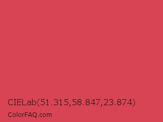 CIELab 51.315,58.847,23.874 Color is a normal red color and the nearest color is Brick Red #cb4154. Hex code #d94455 and RGB value is rgb(217,68,85). In RGB color space, this color is composed of 85% red, 27% green, 33% blue, In CMYK color space, this color is composed of 0% cyan, 69% magenta, 61% yellow , 15% black , In HSL color space, this color has a hue angle of 353° , 66% saturation and 56% lightness.