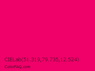 CIELab 51.319,79.735,12.524 Color is a normal rose color and the nearest color is Vivid Raspberry #ff006c. Hex code #f00069 and RGB value is rgb(240,0,105). In RGB color space, this color is composed of 94% red, 0% green, 41% blue, In CMYK color space, this color is composed of 0% cyan, 100% magenta, 56% yellow , 6% black , In HSL color space, this color has a hue angle of 334° , 100% saturation and 47% lightness.