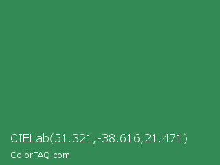 CIELab 51.321,-38.616,21.471 Color is a normal green color and the nearest color is Sea Green #2e8b57. Hex code #348a54 and RGB value is rgb(52,138,84). In RGB color space, this color is composed of 20% red, 54% green, 33% blue, In CMYK color space, this color is composed of 62% cyan, 0% magenta, 39% yellow , 46% black , In HSL color space, this color has a hue angle of 142° , 45% saturation and 37% lightness.