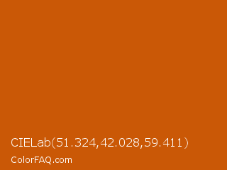 CIELab 51.324,42.028,59.411 Color is a normal orange color and the nearest color is Tenn #cd5700. Hex code #ca5806 and RGB value is rgb(202,88,6). In RGB color space, this color is composed of 79% red, 35% green, 2% blue, In CMYK color space, this color is composed of 0% cyan, 56% magenta, 97% yellow , 21% black , In HSL color space, this color has a hue angle of 25° , 94% saturation and 41% lightness.
