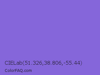 CIELab 51.326,38.806,-55.44 Color is a light indigo color and the nearest color is True V #8a73d6. Hex code #8566da and RGB value is rgb(133,102,218). In RGB color space, this color is composed of 52% red, 40% green, 85% blue, In CMYK color space, this color is composed of 39% cyan, 53% magenta, 0% yellow , 15% black , In HSL color space, this color has a hue angle of 256° , 61% saturation and 63% lightness.